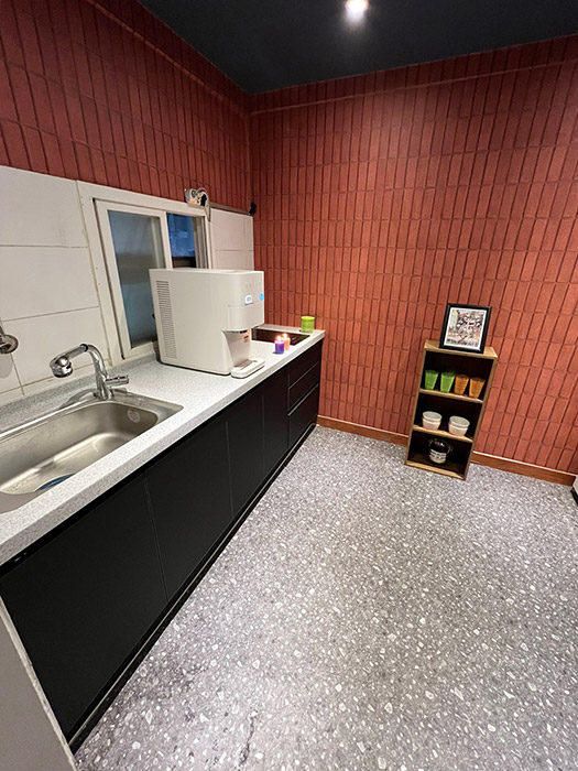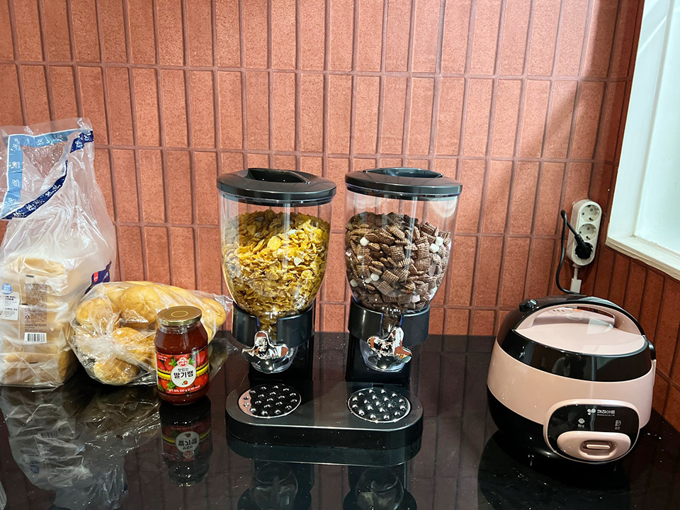 출입자 코로나19 방역 열 감지기 설치, 주방겸 휴게실, 전기압력밥솥, 원두커피머신, 건조기, 각종 그릇과 주방비품이 구비되어 있습니다.